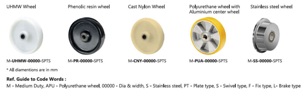 Made of polyurethane wheel on waterproof precision ball bearing 2RS wheel center made of nylon tread made of injected polyurethane hardness 85 shore A & 95 shore A Non-marking smoothness & silence.